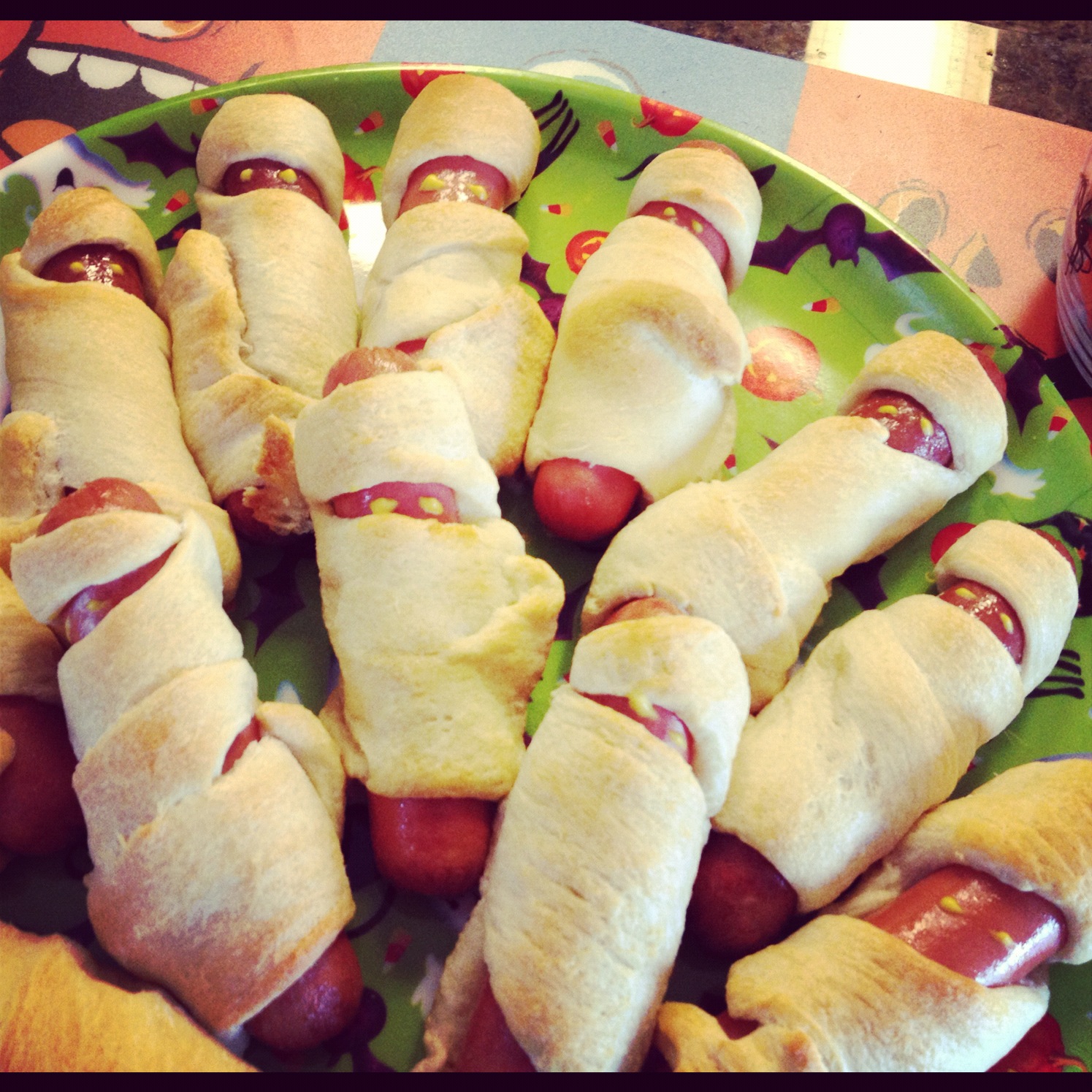 Mummy Dogs... hot dogs wrapped in crescent rolls and baked.... mustard for eyes....